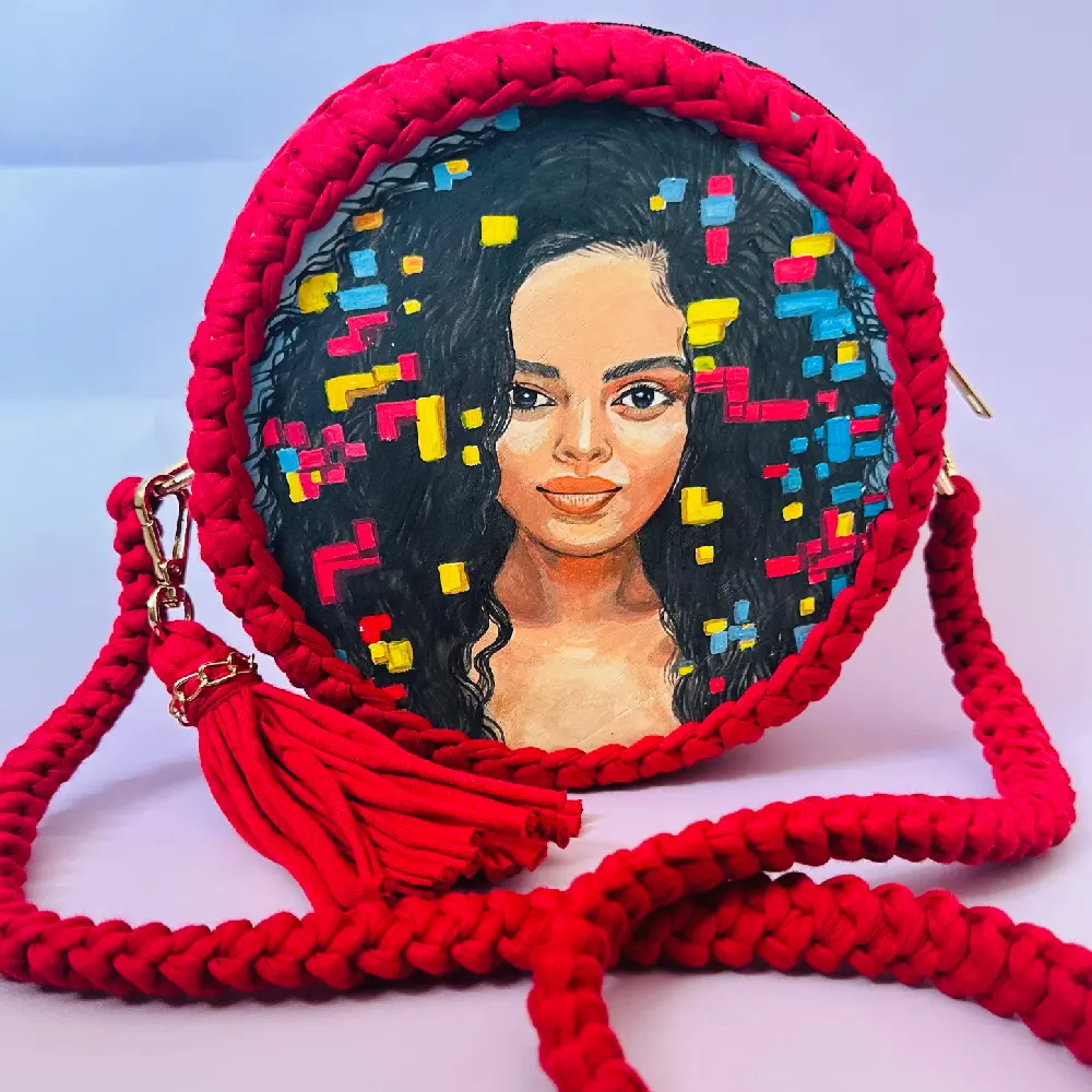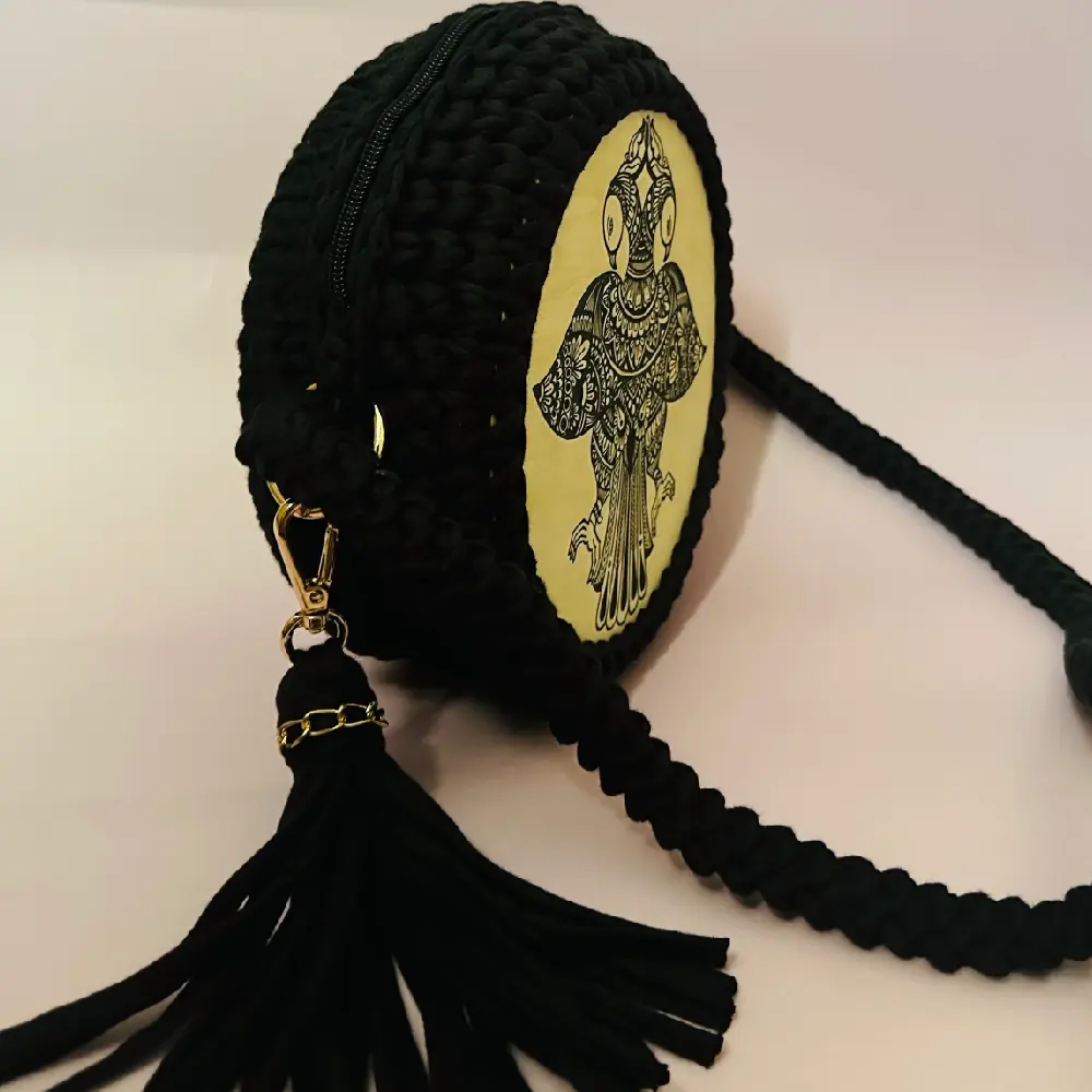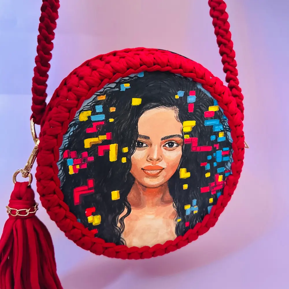A true fusion of craft and creativity, this handmade bag features a hand-painted wooden panel paired with beautifully crocheted textures. Every piece is one-of-a-kind, showcasing intricate brushwork and soft yarn details that make it both a statement accessory and a work of art.
